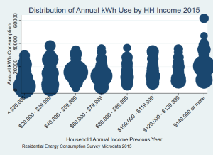 Surveys conducted by the Energy Information Administration[1] tell a very different story than the utilities—electric consumption is highly correlated to income. This graph shows us that in the South Atlantic Census Division those with 2015 household incomes up to $20,000 used only 10,219 kWh in the previous year, or 908 kWh per month. That compares to nearly twice the consumption (19,971 kWh annually and 1,660 kWh monthly) for those making over $140,000.