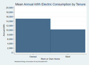 We see similar patterns if we look at renters versus owners: 858 kWh per month for renters compared to 1,257 kWh per month for owners. Consumers 65 and above used 1,062 kWh per month compared to 1,141 kWh on average for those under 65.